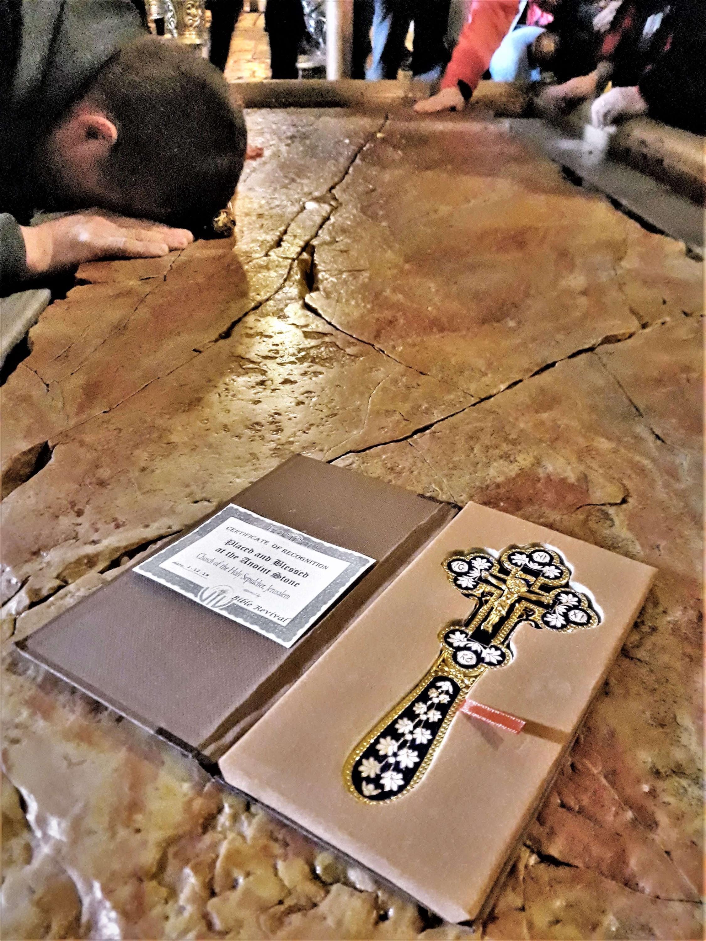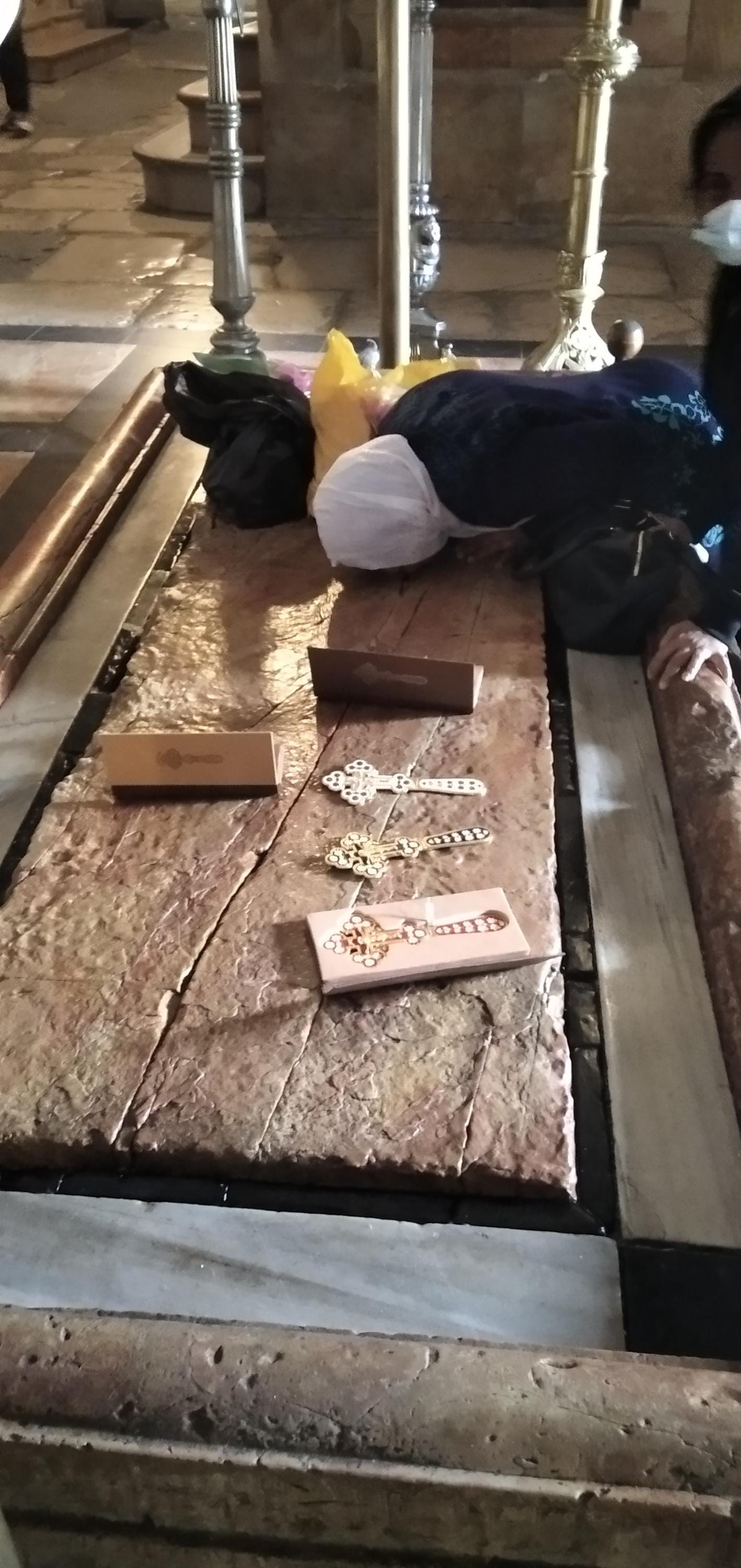 Each piece has been placed at the Stone of Anointing within the Church of the Holy Sepulchre.